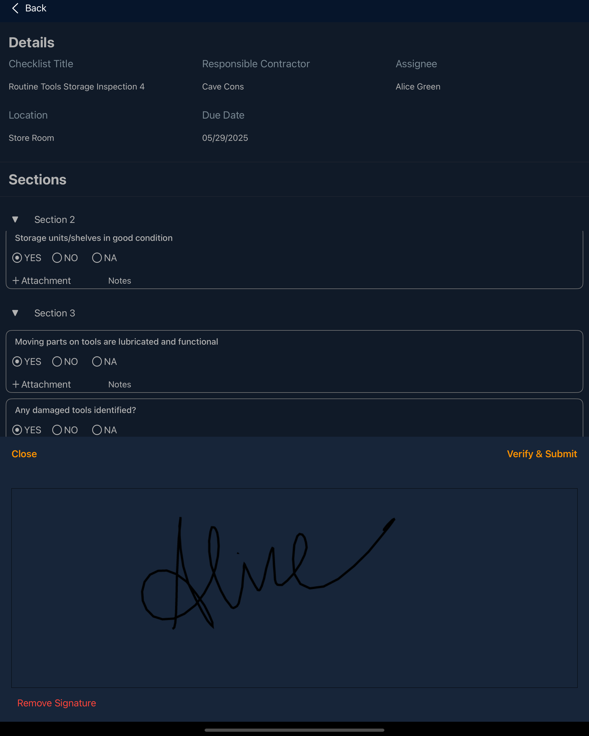 The confirmation dialog appears with your signature. If you haven't registered your signature to your user profile yet, you will be prompted to add your signature. You can also remove the already registered signature and add a new hand-drawn signature before submitting the checklist.