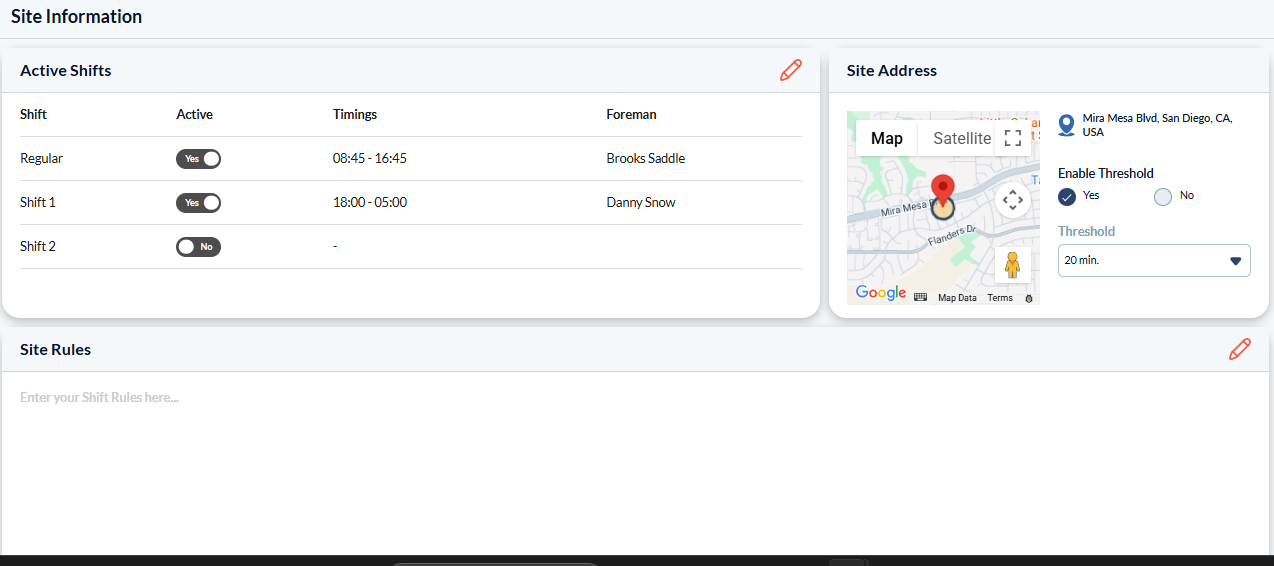 - Set up the site threshold to allow temporary movement outside the geofence. If a worker is away from the geofence for more than a specified threshold period, he/she will be clocked out.