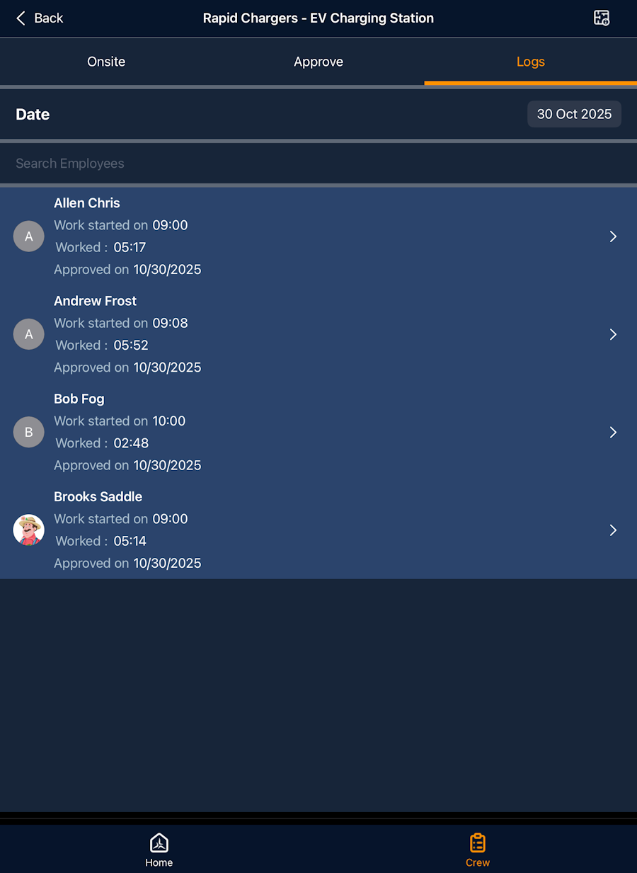 You can view the list of approved timecards for any day from the 'Crew' > 'Logs' screen.