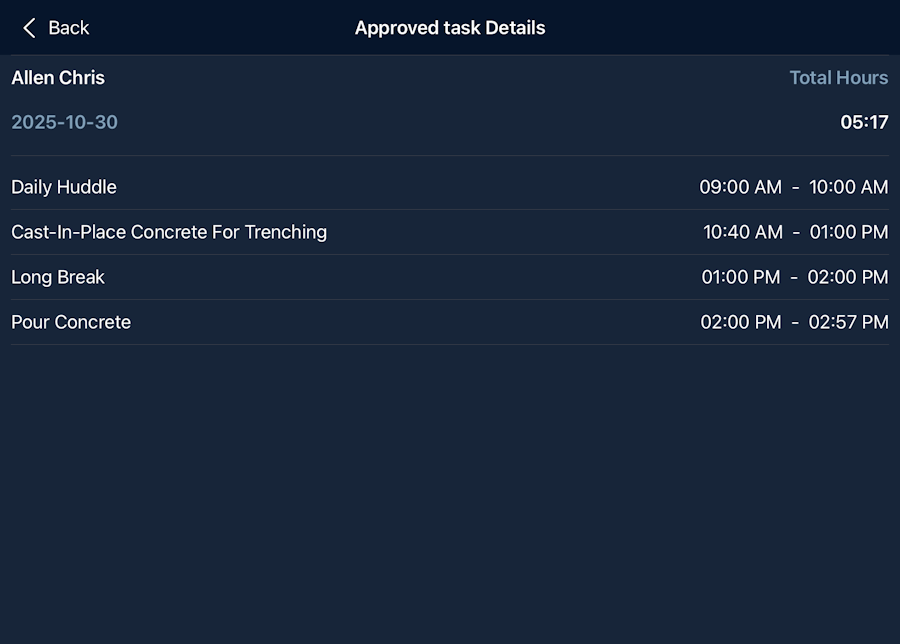 - Tap a timecard to view the details of the tasks and time spent on each task.