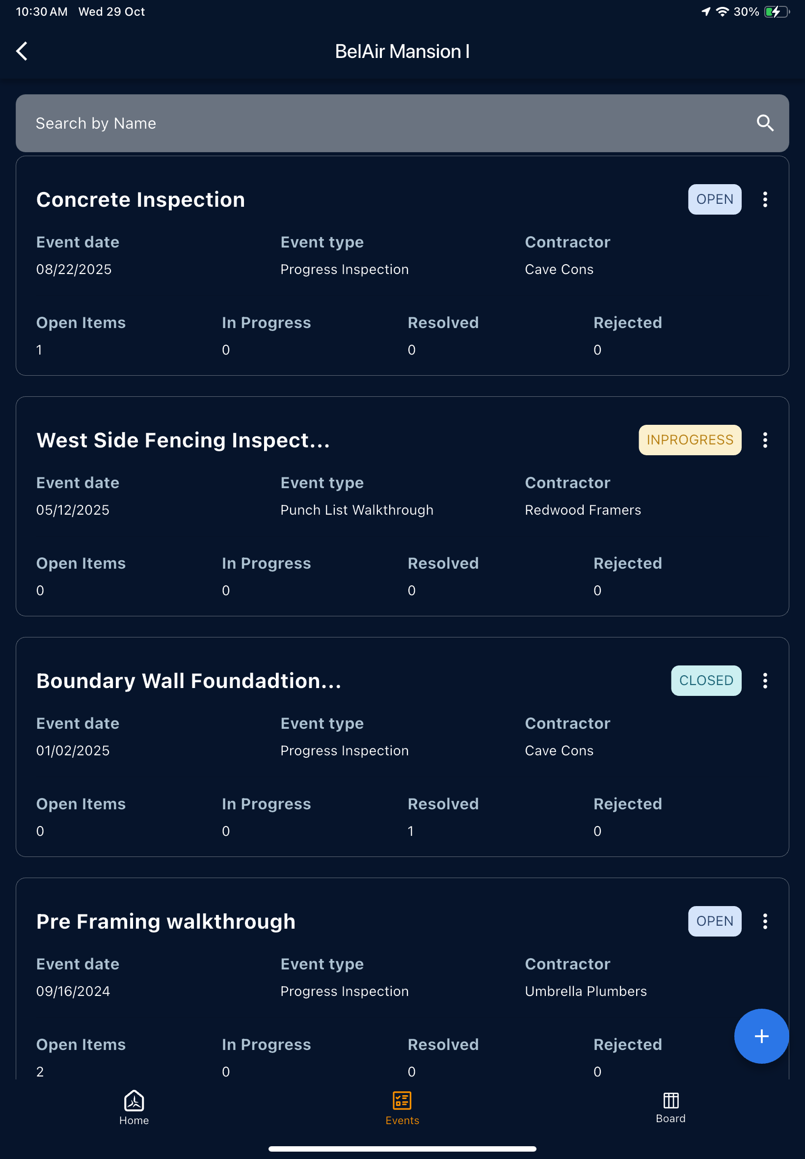 The module opens at the 'Events' screen. Switch between the 'Events' list view and the 'Board' view using the options at the bottom.