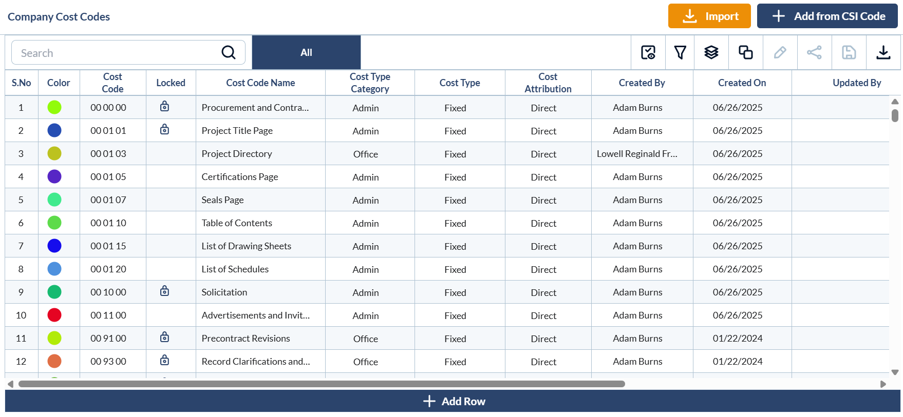 - Repeat the process to add more cost codes from the CSI MasterFormat.