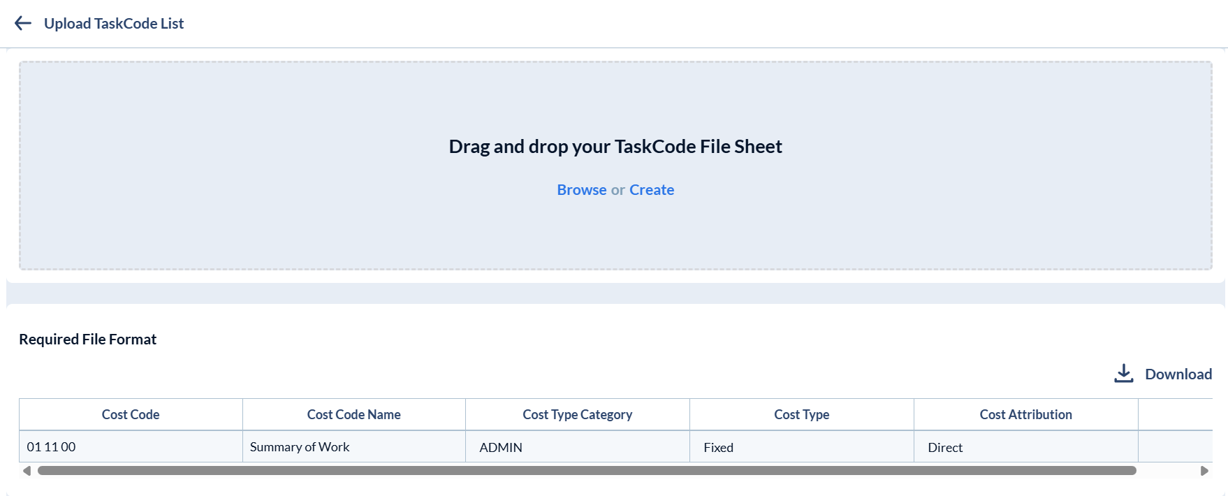 - Ideal for large updates: Bulk creation is especially useful for uploading your entire standardized list during initial setup, importing highly specific codes to track distinct deliverables, or quickly adding batches of new codes for Time & Materials (T&M) and recurring costs.