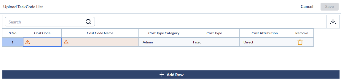- Click 'Add Row' and repeat the process to add more cost codes to the list