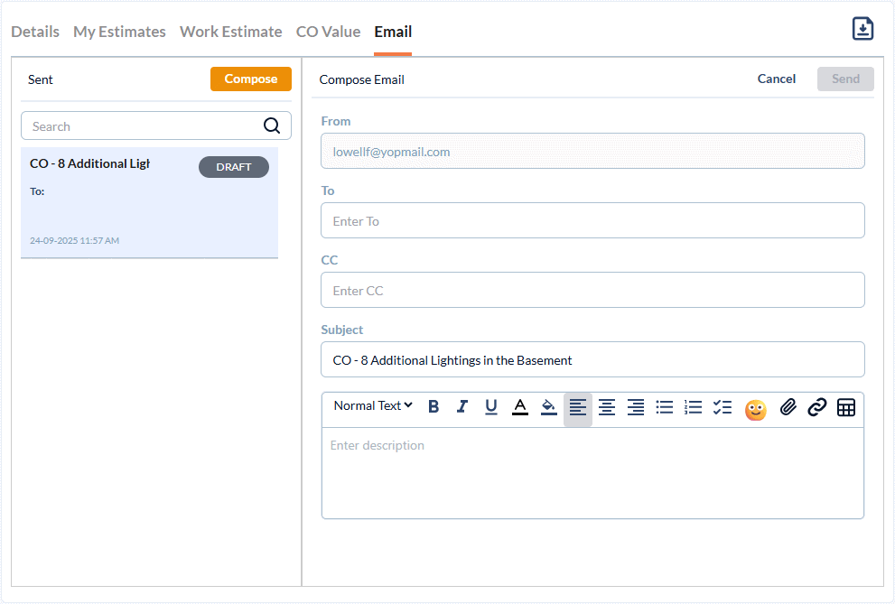Background: By default, Linarc routes change orders for estimate submission, approval, and other actions only to stakeholders listed in the project directory. This ensures that project members can access, review, and act on items directly from their Linarc consoles, enhancing communication and decision-making within the platform. However, the construction team may also need to involve external stakeholders, such as vendors and specialty contractors, who are not yet registered in Linarc. Since these parties cannot be added to the project directory until their registration is complete, the built-in email feature allows you to request their input, approval, or endorsement of a change order as needed. This ensures that essential contributors outside the platform can participate in the review process seamlessly.
