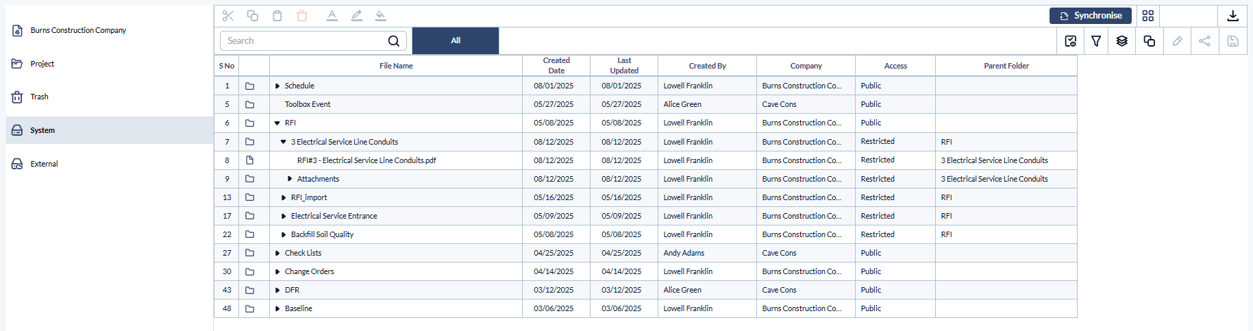The System Drive in the file repository provides an automated solution for archiving successfully closed and published project documents such as submittals, RFIs, and daily reports.
