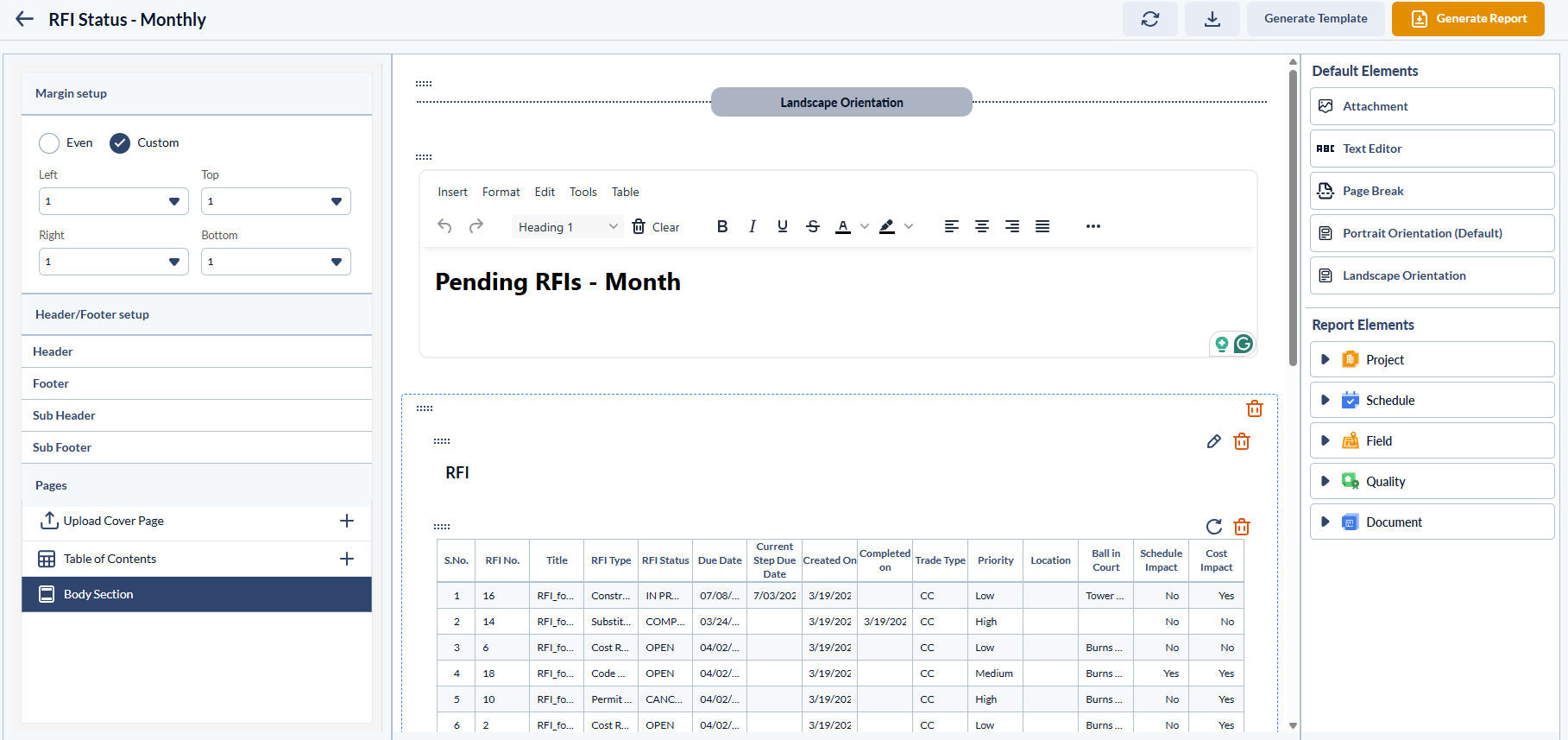 - Use standard Templates: Quickly generate reports using Linarc’s curated library of templates designed for common project reporting. You can clone and modify a system template to fit your needs and save it as a new custom template for report generation.