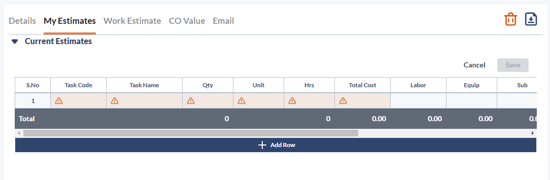 The 'My Estimate' tab lets you add your estimate for the change order as an Excel file. You can download the template file, enter the values, and upload the same as your estimate. The tab is enabled only after you fill out all mandatory fields under the 'Details' tab.