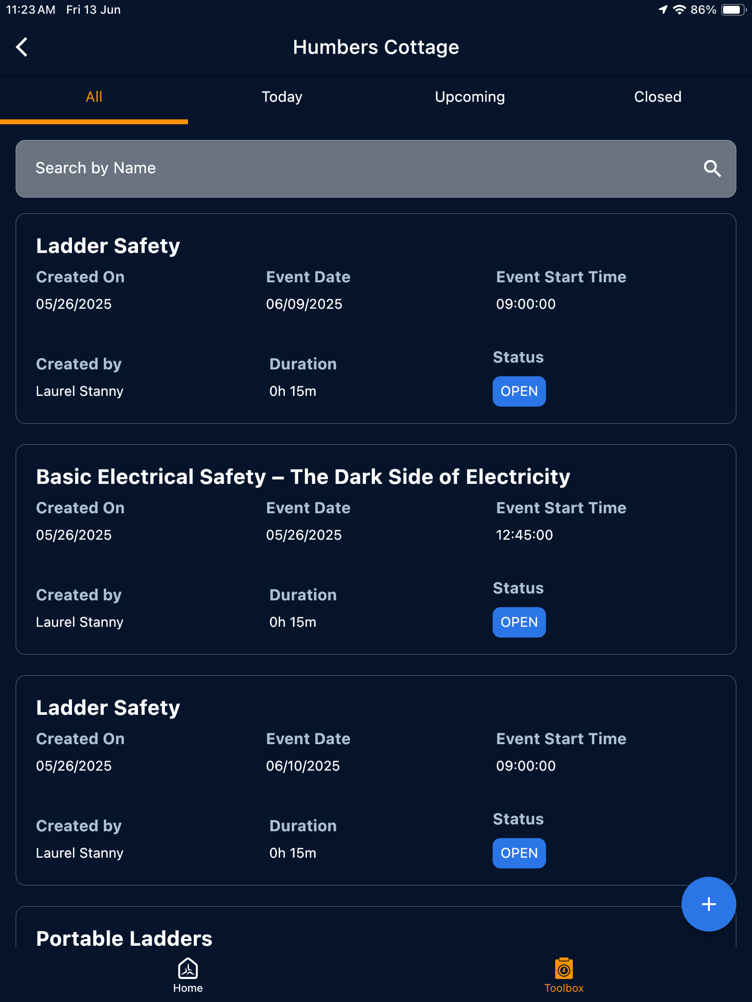 Users with appropriate permissions can create ad hoc toolbox talk events when needed.