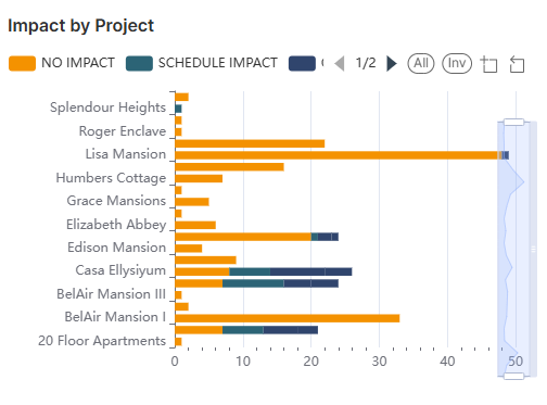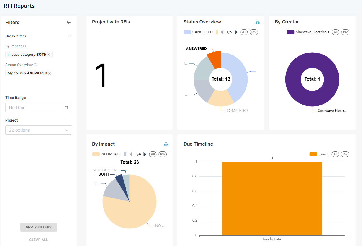 For example, if you want to view statistics of RFIs that are in 'Answered' status, have both schedule and cost impact, you can cascade these two filters from the respective charts: