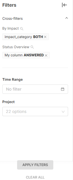 The cross-filtering feature enables you to choose a category on one chart and instantly apply that category as a filter across all visualizations. This action refines the data displayed in the other charts, showing only the statistics related to the selected category of RFIs. Additionally, you can layer multiple filters by selecting different sectors across the charts, allowing for deeper, more specific analysis of the filtered results.