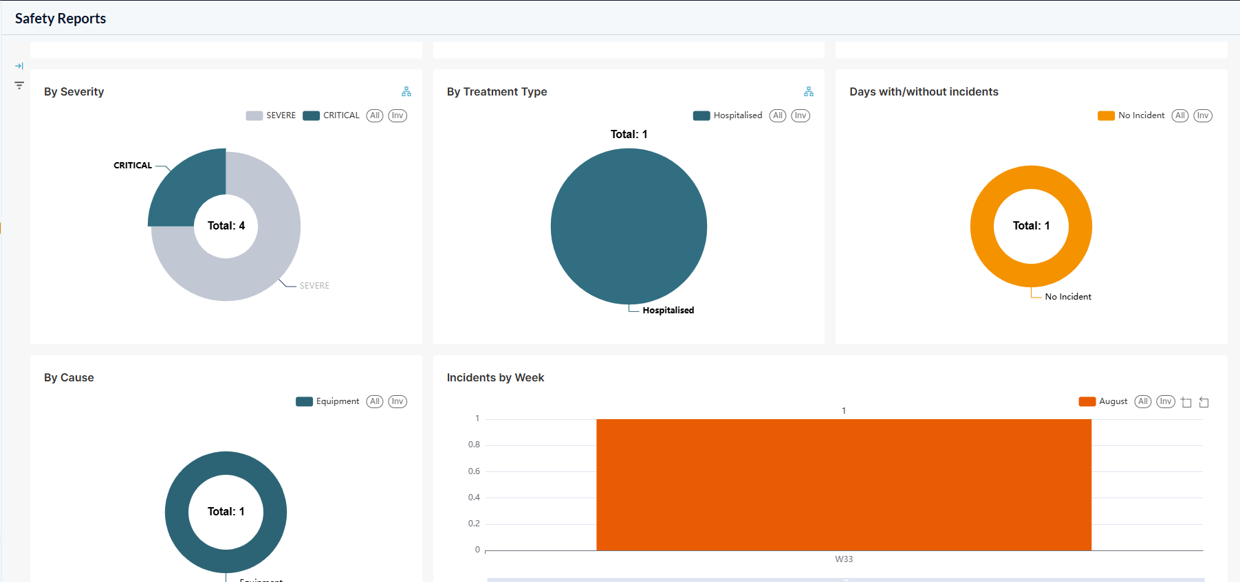 With built-in cross-filtering, any selection you make in a chart or visualization instantly updates all others, allowing you to focus on specific incident types, locations, contractors, or time periods. This interconnected view helps you quickly drill down, uncover patterns, and perform deeper analysis with ease. For detailed guidance, see the Cross Filtering Options section.
