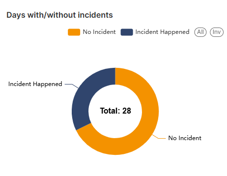 Displays the breakdown of working days—from the earliest project start date to today—showing how many days had reported incidents and how many were safe days with no incidents.