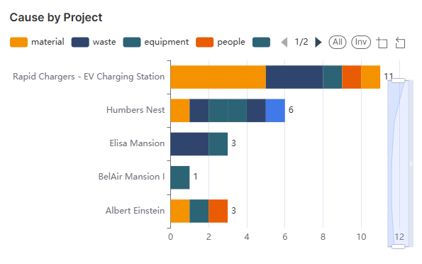 The bar chart shows the number of safety incidents reported for each project, with each bar further segmented by the identified root causes. This breakdown helps you quickly compare contributing factors across projects and spot patterns that need attention.
