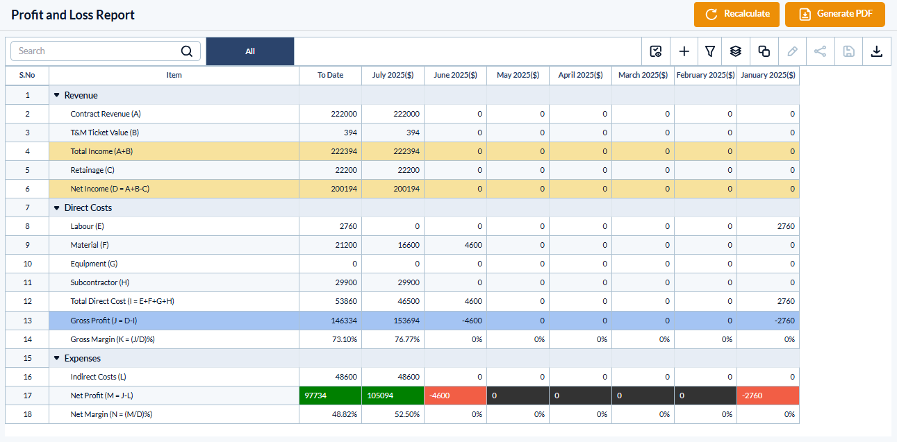 The Profit and Loss report highlights your project’s overall financial outcome, showing how revenue compares with costs to determine profitability.