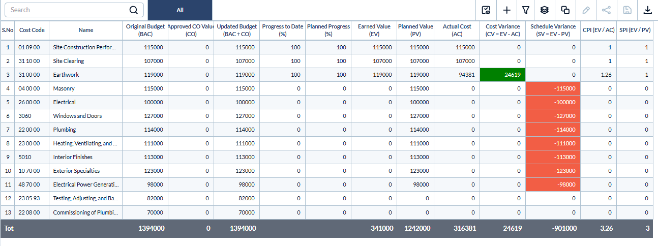 - Schedule Variance (SV = EV – PV) – The monetary difference between the actual work completed and the planned work, indicating whether the activities linked to the cost code are financially ahead of or behind the planned schedule.