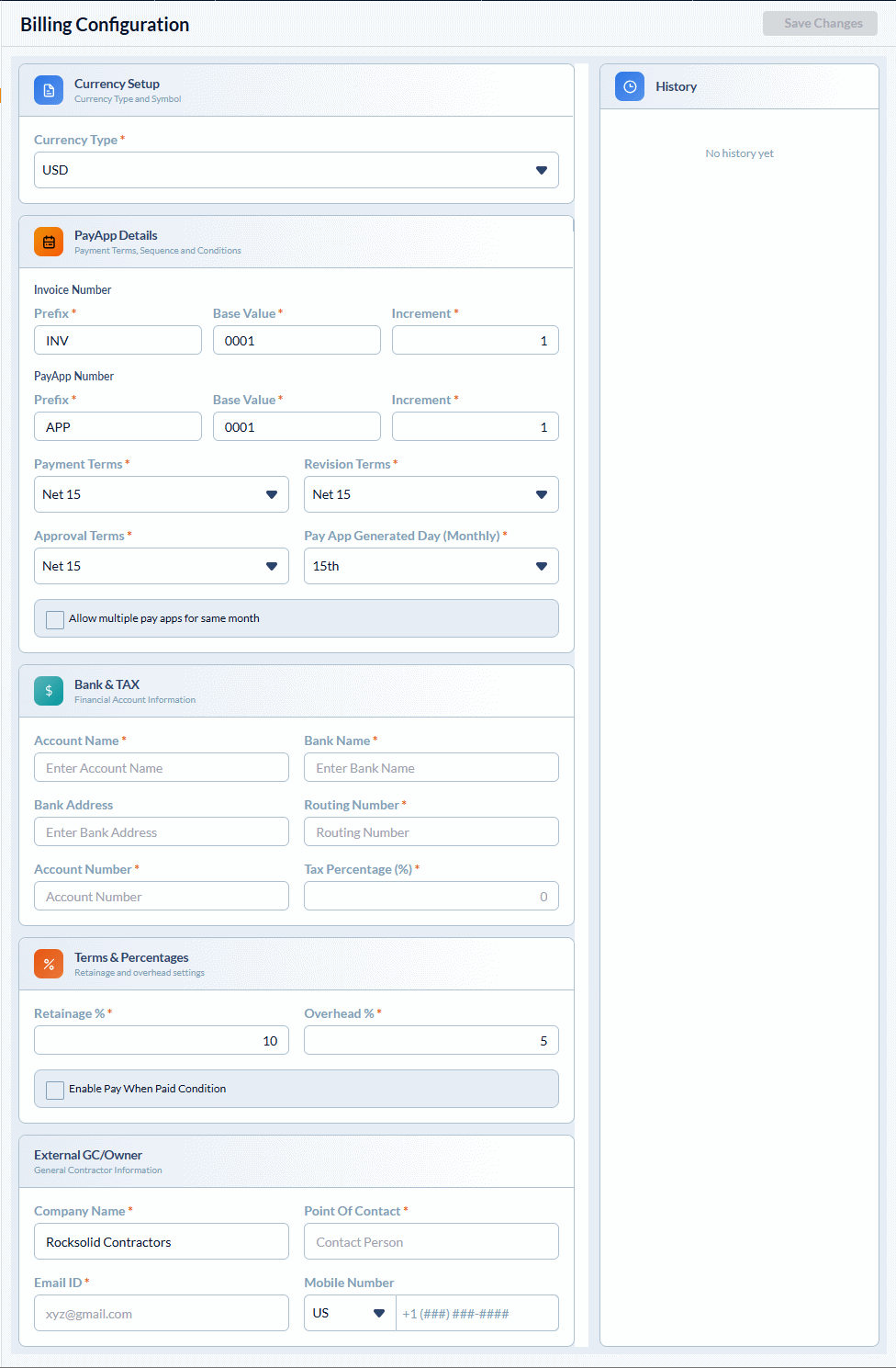 External GC/Owner The paying party's information, which will appear on all submitted Pay Apps and invoices.