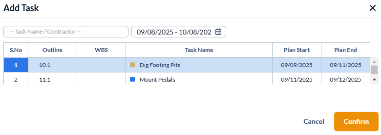 - Search the task by its name or use the date picker to view the list of tasks in a specific date range.