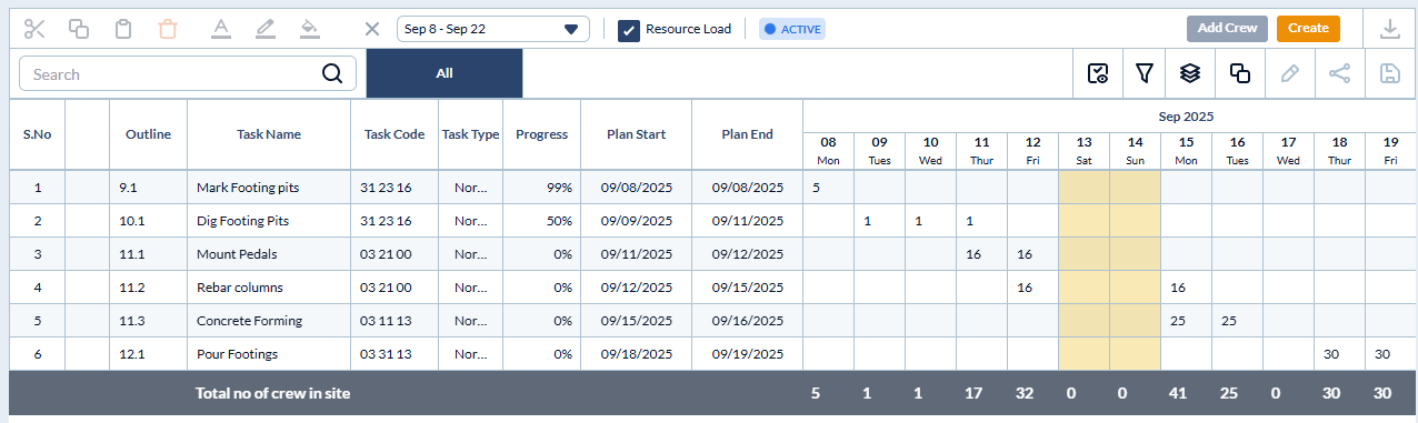Crew members can be added to tasks only in the Active Look Ahead schedule and only for tasks that belong to your company.
