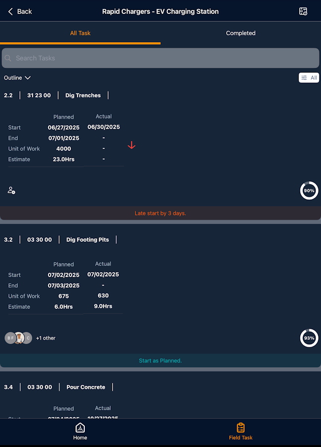 - All Tasks- Shows all tasks in the project's field schedule as assigned by the project manager and the tasks that are taken for execution.