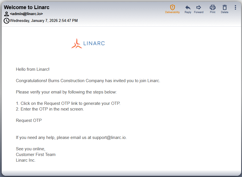 Linarc automatically sends an invitation to the user's registered email. To begin, the user simply follows the activation instructions in the email and clicks 'Request OTP' to commence their account setup. An example is shown below: