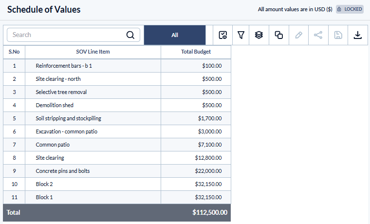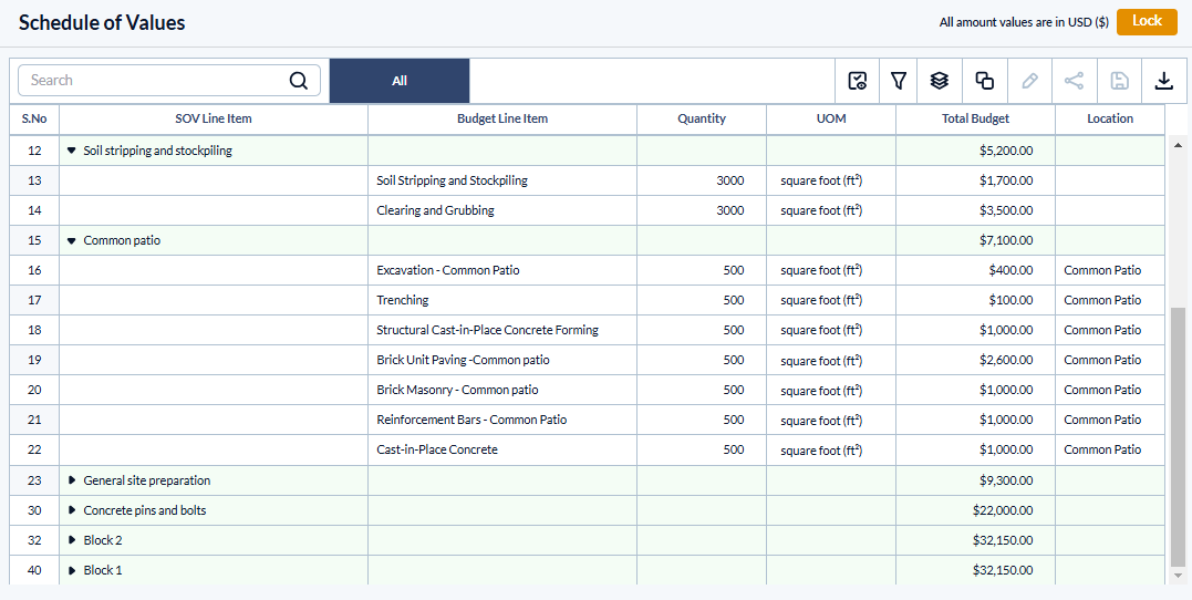 Note: You can rearrange line items under any group as often as needed. However, once the SOV layout is locked, groups and layout settings can no longer be edited.