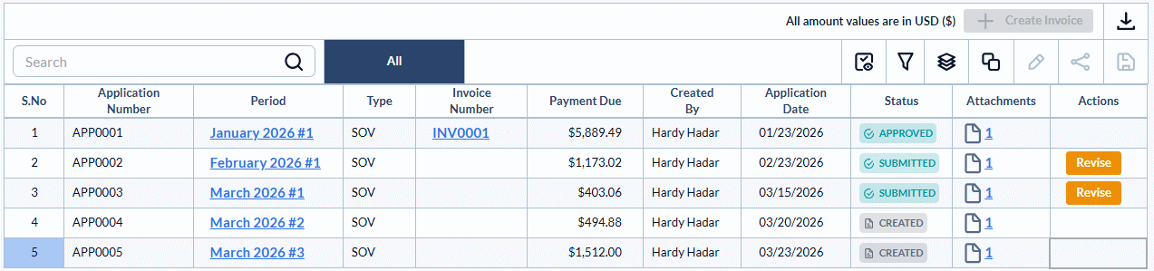 The screen shows the list of Pay Apps generated so far, with the unsubmitted Pay Apps in 'Created' state: