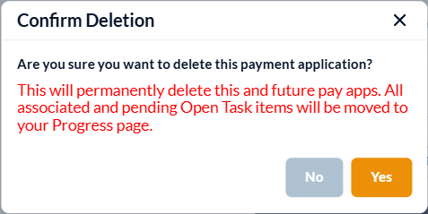 Important Warning: Deleting a pay app has a cascading effect. If you proceed, all subsequent pay apps created after this one will also be permanently removed from the system, allowing you to start the pay apps generation afresh.