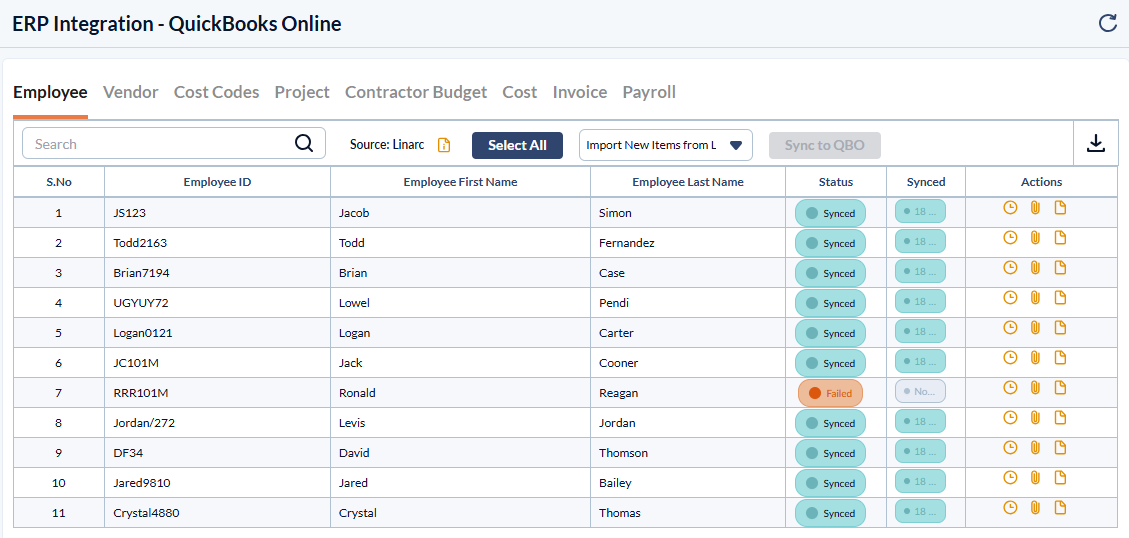 The Employees tab in Linarc's Staging Platform allows you to check the synchronization status of your company's workforce directory between Linarc and QuickBooks Online (QBO). You can manually initiate a sync at any time, ensuring that employee profiles remain perfectly consistent across your operational and accounting systems without requiring duplicate manual data entry.