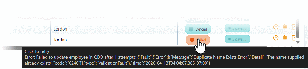 Synchronization can fail for several reasons. You can view the exact cause of the error by hovering your mouse over the Failed status indicator. Once identified, you can manually reconcile and sync these entries.