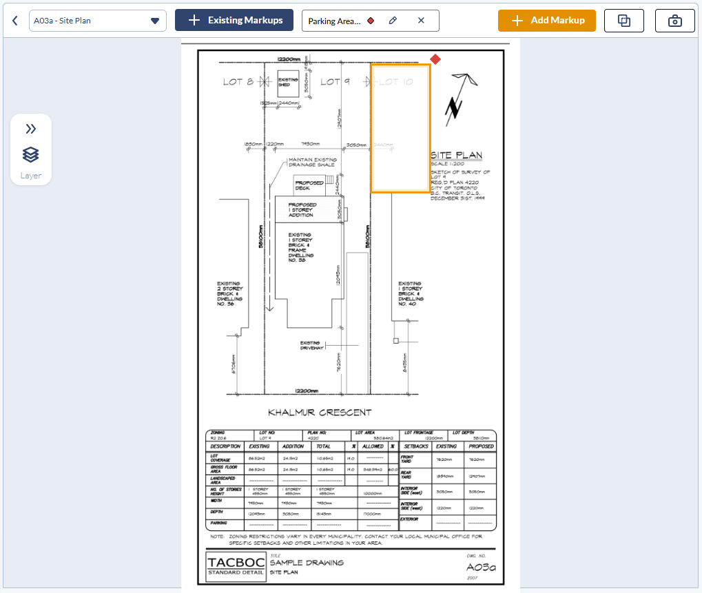 Opening a plan drawing from the 'Plan Sheets' screen displays its latest version in a dedicated viewer. This screen provides you with several tools to interact with the drawing, allowing you to: